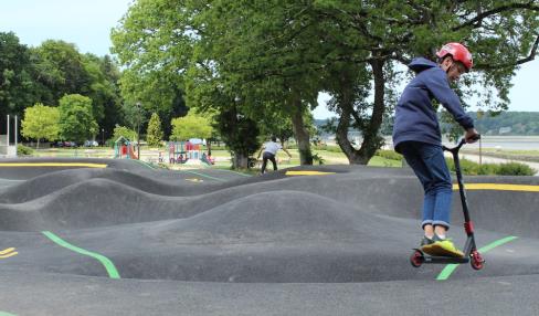 Un très bel emplacement pour cet espace ludique, à l'entrée du village en front de mer avec vue la rivière et la baie de Morlaix ! - Espace de glisse universel ou pump-park mis en service en 2019, pour pratiquer bicross (BMX), skate, roller acrobatique ou trottinette - Jeux pour enfants - Parking et sanitaires publics