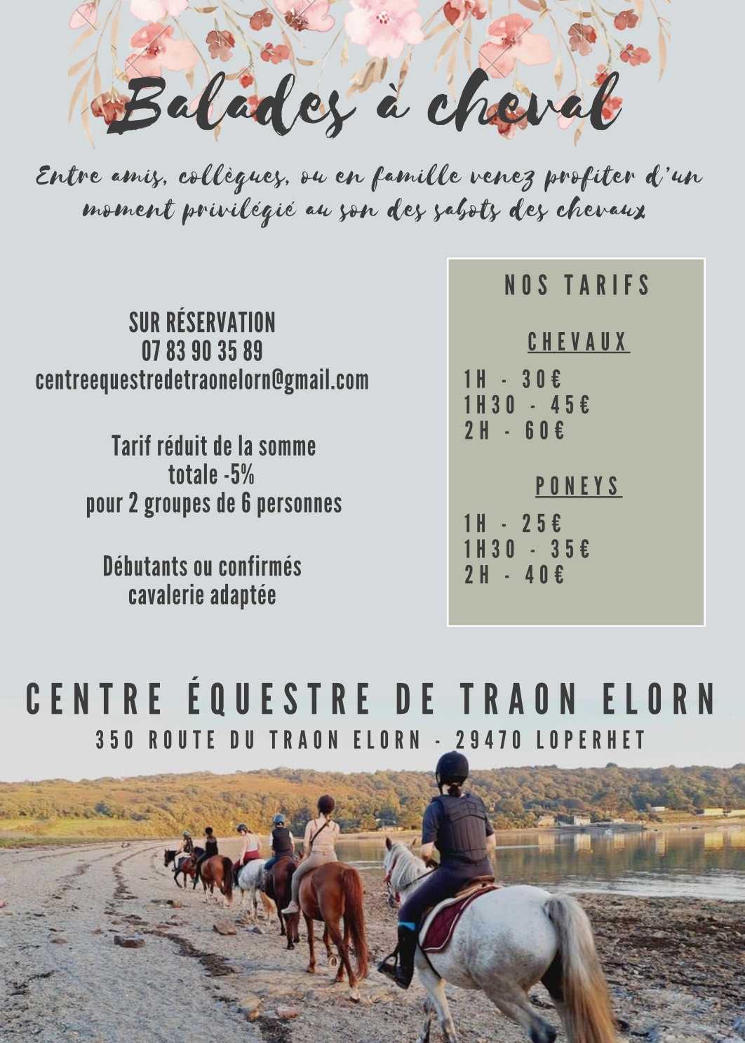 Centre équestre basé à Loperhet. Loisir et perfectionnement sur poneys et chevaux d'école ! Activités diverses : saut, dressage, balade, cross, horse ball... En été, le centre équestre propose des balades à cheval et à poney ainsi que des cours individuels et des stages sur réservation.