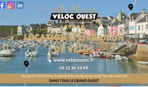 Partez à la découverte de paysages merveilleux à vélo avec Veloc’Ouest. Nos vélos tous chemins et nos vélos à assistance électrique seront vos meilleurs acolytes durant vos escapades. Nous vous mettons à disposition des vélos à assistance électrique exclusifs et qualitatifs de marque allemande et française. Alors venez profiter de notre service de livraison de vélos. Réservez votre vélo en ligne, en remplissant les dates de location, ainsi que le lieu de livraison sur : www.velocouest.fr. Nous assurerons la sécurité de vos transactions. Possibilité de louer votre vélo 24h avant la date de début. Faites-vous livrer votre vélo directement chez vous, ou faites-vous livrer votre vélo à un point A et restituer le à un point B. Pour plus d’informations contactez-nous : Par mail : contact@velocouest.fr ou par téléphone au 06 23 36 24 98 Périodes d'ouverture : Livraison toute l’année.