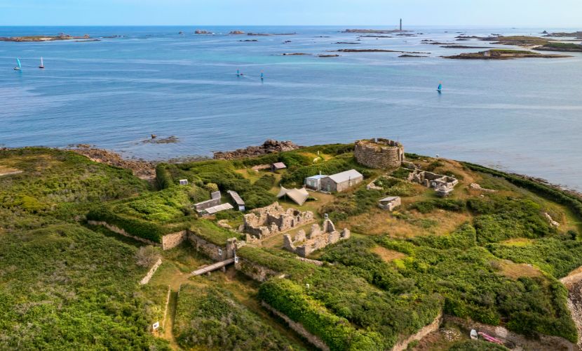 Du sommet de la tour d’artillerie, haute de 14 mètres au-dessus du niveau de la mer, la vue est imprenable : l’Île Wrac’h, l’Île Vierge avec son phare – le plus haut d’Europe ! -, l’Île Stagadon, la Presqu’île Sainte-Marguerite, …