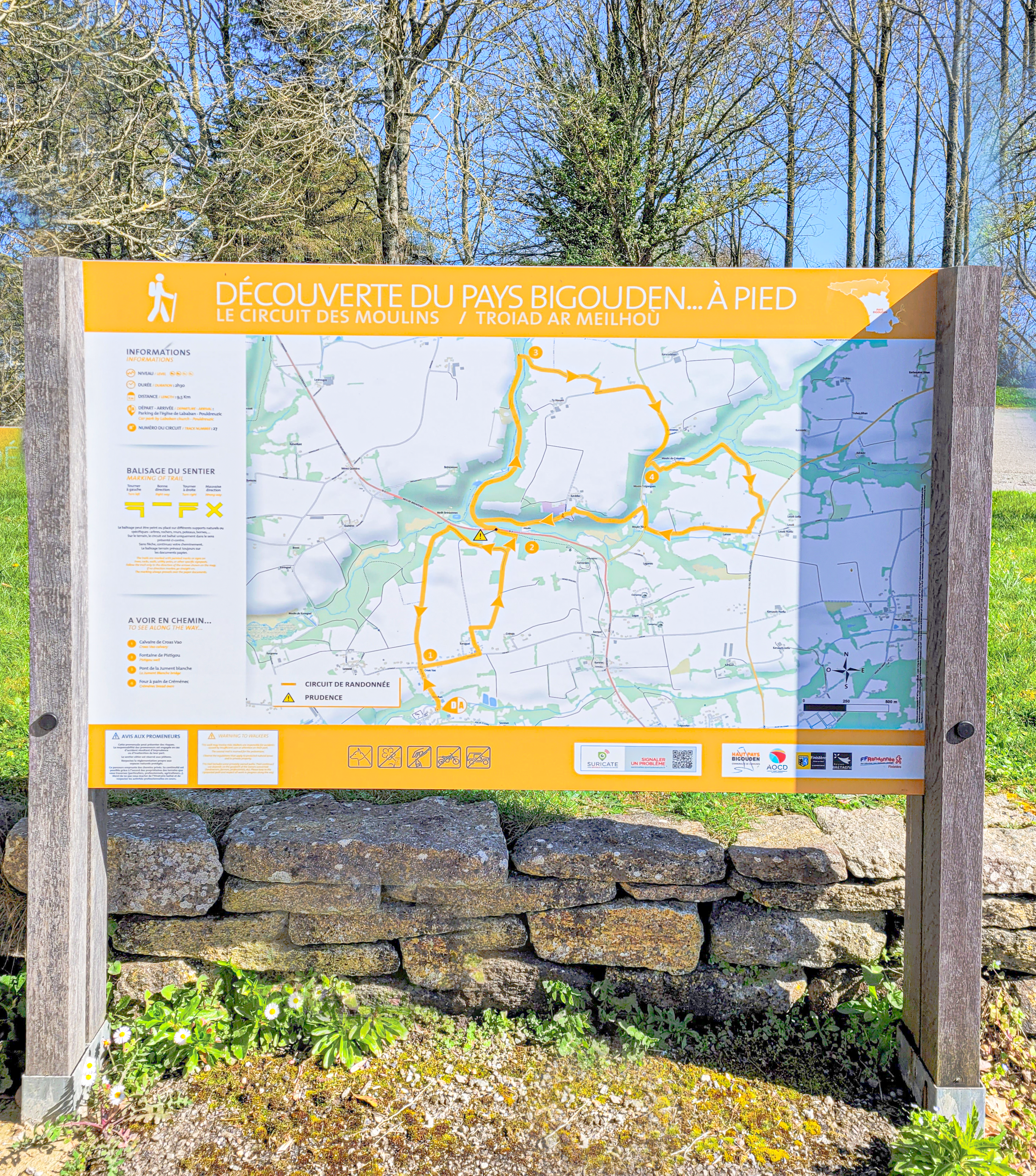 Parcourez les vallées de la commune de Pouldreuzic. Ce circuit vous emmènera dans les vallées de Pouldreuzic, à la découverte du petit patrimoine local : fontaine de Pistigou, four à pain de Créménec au calvaire de Croaz Vao, ainsi que la Chapelle de Lababan. Départ/Arrivée : Parking de l 'église de Lababan. Balisage : PR jaune. Le balisage terrain prévaut toujours sur les documents papier ou numériques. Sens de l'itinéraire : horaire Dénivelé : 134 m Infos pratiques : Toilettes publiques sur le Parking de l 'église de Lababan. Une aire de pique-nique à l'église de Lababan Conseils avant de partir : Emportez de quoi vous restaurer (boisson, en-cas) et un sac pour vos déchets. Avis aux promeneurs : Afin de respecter l’intégrité du milieu naturel que vous traversez, il est primordial de fixer des embouts caoutchoutés sur les pointes de vos bâtons. En effet, le passage répété de promeneurs avec des bâtons de marche non protégés peut, à moyen terme, avoir des conséquences irréversibles comme le décapage des sols et de la végétation, le ravinement et l'élargissement de l'emprise du sentier. Traversée de RD 2. Randonner avec son chien Les chiens sont les bienvenus sur ce circuit. Soyez prudents, le circuit passe sur des routes très fréquentées où il faut tenir votre chien en laisse. Afin de visualiser les variantes et le tracé en détails, nous vous conseillons de télécharger une application lisant les fichiers GPX (openrunner, gpx viewer ou tout autre application de lecture de fichiers gpx de votre choix).