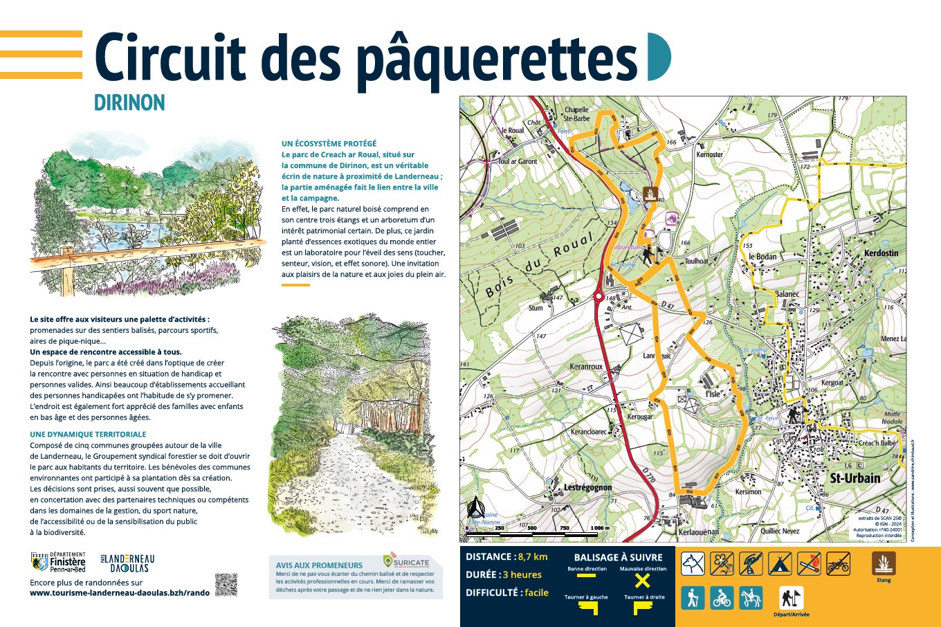 Ce circuit vous propose de découvrir le parc des Pâquerettes, avec son bois, son étang et son ancienne enceinte médiévale. Il vous invite également à explorer la campagne de Dirinon à travers de petits chemins de campagne, notamment près du lieu-dit de l’Isle. Vous pourrez apprécier de belles vues sur les Monts d’Arrée et profiter de la nature avec sa faune et sa flore. Quelques recommandations : – En hiver ou après la pluie, pensez à de bonnes chaussures, le sentier peut être glissant. – Restez sur les sentiers et évitez de marcher dans les zones fragiles. – Tenez votre chien en laisse, et gardez-le près de vous quand vous croisez d’autres randonneurs.