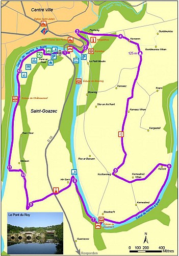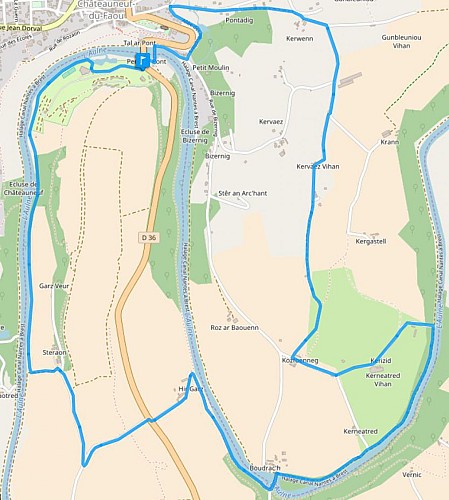 Départ : Penn ar Pont - Contre halage sous le pont de la D 36 Carte I.G.N : 0618 OT, Châteauneuf-du-Faou, Vallée de l'Aulne, PNR d'Armorique Top 25 Dénivelé positif : 172 m Difficulté : Peu accidenté à part la côte de Pontadig Balisage : Bleu