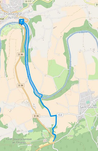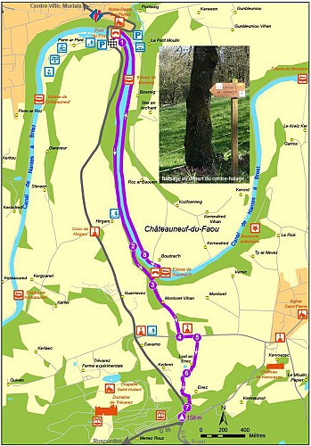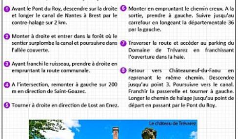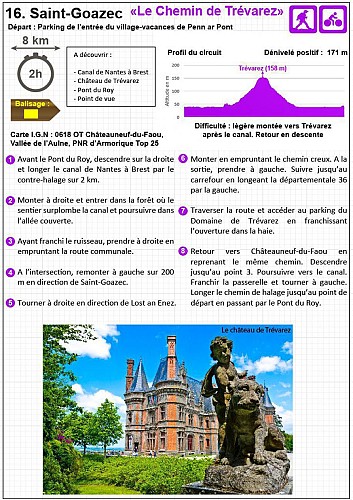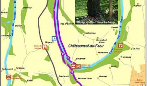 Départ : Parking de l'entrée du village-vacances de Penn ar Pont Carte I.G.N : 0618 OT Châteauneuf-du-Faou, Vallée de l'Aulne, PNR d'Armorique Top 25 Dénivelé positif : 171 m Difficulté : légère montée vers Trévarez après le canal. Retour en descente Balisage : jaune